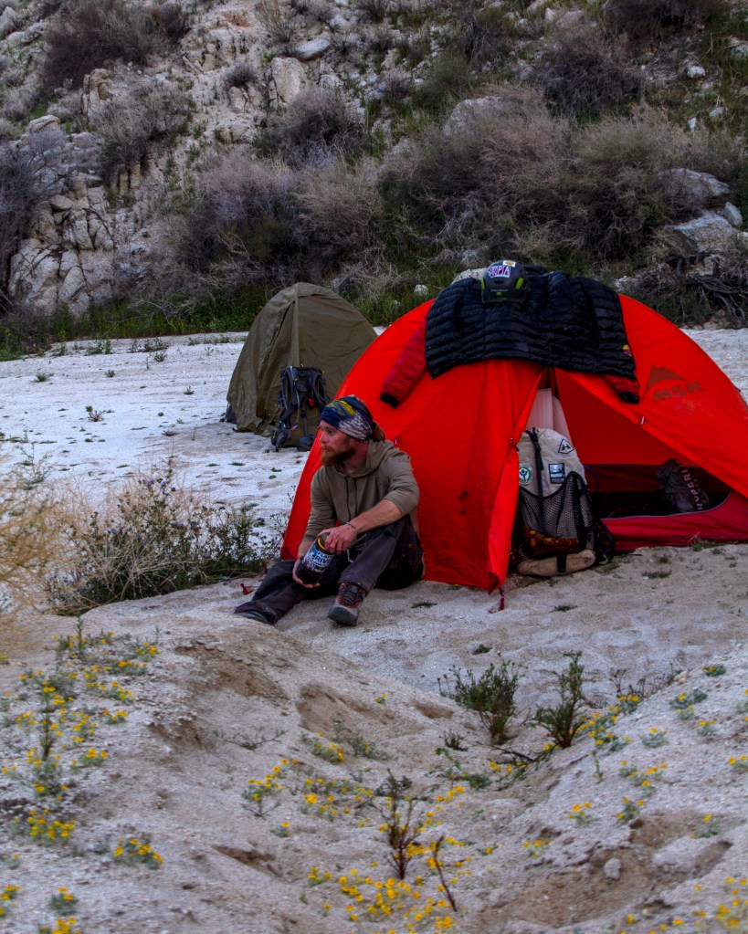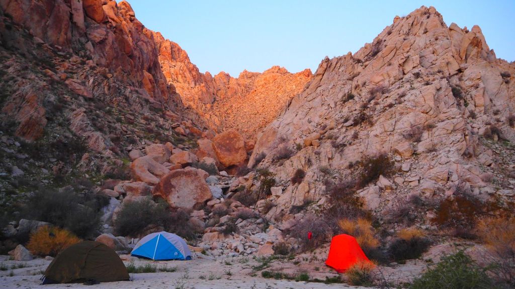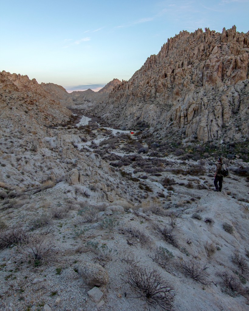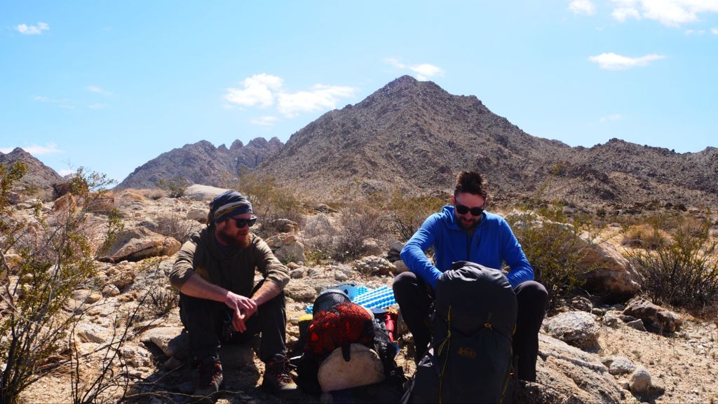 The next morning the sun woke us up and we were off from some coffee at Starbucks in Twenty-Nine Palms before we would break the trail. We stopped by the Visitor Center to acquire our Backcountry Permit and I bought some socks to bring home to Jess! We then drove to the Trailhead and began our trek. The entire route was off-trail and required some route finding. We crossed a long valley while aiming for the entry to a canyon we could see from far away. Once at the mouth of the canyon, we followed a wash with Cairns here and there. Before I knew it, the camp was right in front of us! A small sandy spot next to the wash we had been following. Many boulders and Mountain Ridges stood above us. It was time to pitch tents and re-energize.
