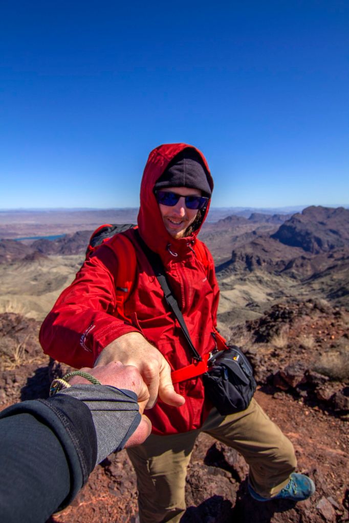 Once awake, Justin and I did some research and discovered a Wilderness Area called Whipple Mountain Wilderness. It was not a far drive so we decided to do a day hike of Cupcake Mountain within the Wilderness Area. After breakfast we set off, driving on many miles of windy dirt roads. In some places, it felt like the road had an edge right next to us… Dropping below. It was not long before Justin and I arrived at our trailhead. Dusty and Sun exposed we were here. I lent Justin a North Face backpack and we were off. It was a slightly windy day and most of the photographs I tried to take would be from the shade for softer lighting. The pair of us made our way up the trail. Views of Lake Havasu far before and behind us. It was warm out, and once we arrived at the final push, a hiker could see the remains of a tent tangled on the side of the mountain. Later I would try to climb up to pack out the abandoned gear but failed because I was not comfortable with the climb. I did, however, pack some tent steaks and a tent bag that had not blown away from the summit. Justin and I took in the views of the area, the mountain giving a feeling of desolation but also not too far away from civilization. We made our way back to the Jeeps and then had a parting-of-ways dinner at College Street Brew House and Pub. It was not time to drive back to the Grand Canyon….home!