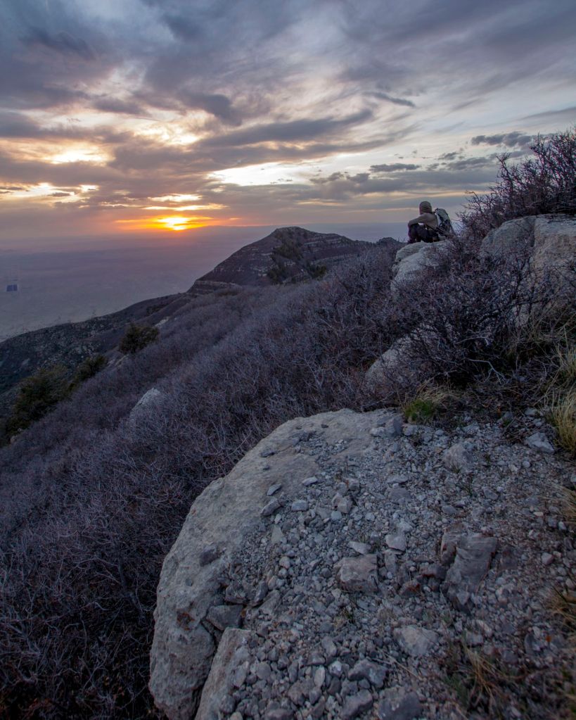 A retirement-age gentleman from the UK. He had fallen in love with the American South West and began his Pilgrimage to thru-hike multiple trails within its grandeur. Once on the trail, we leap-frogged back and forth, one in front of the other. Until we ended up talking. He shared his part of his story, and he wanted to take the tram down the Sandia Mountains to finish his adventure before flying home. He had walked over Sky Islands from Southern Arizona to New Mexico en route to completing the Grand Enchantment Loop Trail. The hiker also shared with me that he was recording moments of his trip for his grandchildren. When he found out I was a Park Ranger in the Grand Canyon, he asked to take a selfie with me for his Grandchildren. After a bit of conversation, we were both off on our own walks again. Before I knew it I was it was time for me to go off trail. The Manzano Crest Trail runs the Ridgeline of the Manzano Mountain Range, and for many moments of this trek, I could see Mosca Peak looming in the distance next to Guadalupe Peak. If you look at a map of the Cibola National Forest, one will see that Mosca Peak is just about on the boundary line of the federal boundary, and then an individual would be on Tribal Land. Once off the Manzano Crest Trail, I walked through what later would remind me in its own unique way of a Mangrove Swamp I had seen in Florida on a Bear Grills episode once. I had never pushed through such thick shrubbery. Slowly, I climbed to the summit, taking many breaks along the way, my entire being swallowed by the magnificents of God’s creation! With another step, I was on top; I was home for the night at last. I ate dinner and photographed the sunset. The clouds on the horizon looking on the verge of bringing a monsoon my way. Singing the Summit Register was emotional, for it read many entries of folks who considered the mountain special or scared. The federal protection of this beautiful land that I had fallen in love with and that God has used in my life so many times…has a flipside and a dark history. A greed and selfishness that that still harms people’s perception of these places to this day, I hope that one day. Humanity can resolve its feelings of pain and betrayal in all fashions, not just when it comes to the wild. I cannot change the past but I will strive to protect these places with my life.