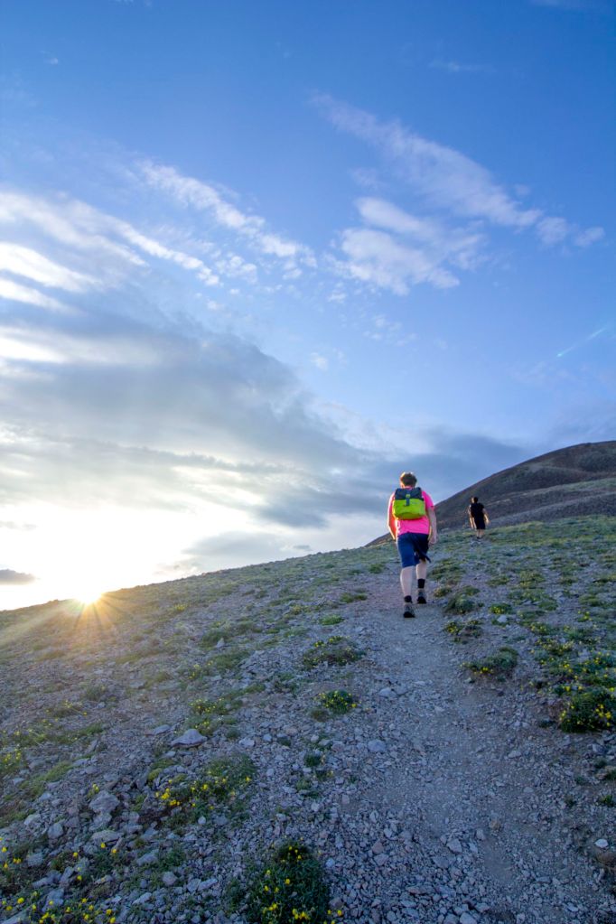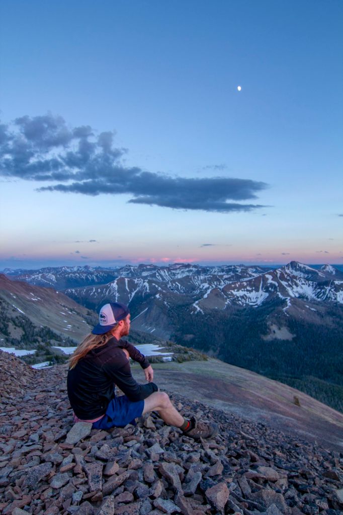 Later that summer some co-workers and I headed out to summit Avalanche Peak for sunset. An Alpine peak that sits above Yellowstone Lake far below. On a clear day, an adventurer can make out the Peaks of the Grand Teton! Nick, Wyatt, and I took the shortest approach as this was an event endeavor, and we had to wait for Nick to get out of work. Luckily, it was Summer, and sunset started late. We drove to Lake and onward to the Trailhead. Stopping at the Sinclair Gas Station in Grant Village for snacks. Once on the trail, we went fast! Knowing we did not have much time until Sunset. We also knew that according to Weather.gov the Park had a percentage chance of Monsoon storms in the high country. We kept our eyes on the vast landscape and horizon… Taking mental notes of the distant storm clouds visible from our ever-heightening perch. We made it out of the tree line and found the summit shortly after the trail meandered through the new Alpine Ecosystem.